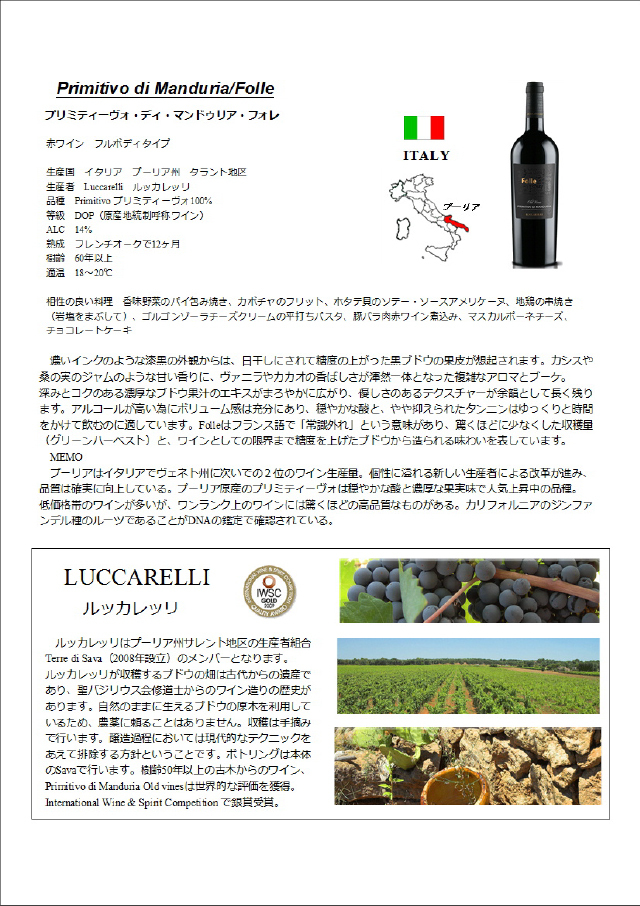 イタリア産 プリミティーヴォ・ディ・マンドゥリア・フォレ