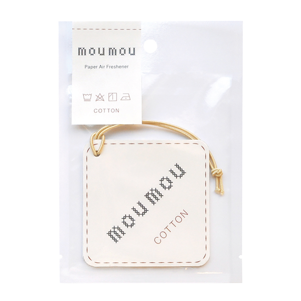 日々の暮らしの中で身近な存在のファブリック。 mou mou (ムームー)は、その代表的な天然の素材を香りで表現したフレグランスです。 衣類やインテリアの素材を選ぶとき、自分にとって心地よいものを選んでいると思います。 同じように、自分の肌に合う香りに包まれて心地よい空間で過ごしてもらいたい、そんな思いを込めて、mou mouを創りました。人にそっと寄り添う、ファブリックの清潔感のある香りをお楽しみください。 ペーパーエアフレッシュナーを吊すだけで、クローゼットやトイレ、車の中など、あなたのプライベート空間をファブリックの柔らかな香りがやさしく包んでくれます。シンプルながらもスティッチのデザインが効いた白いミニクッション風のデザインは見えるところに飾りたくなるかわいさです。人にそっと寄り添う、ファブリックの清潔感のある香り